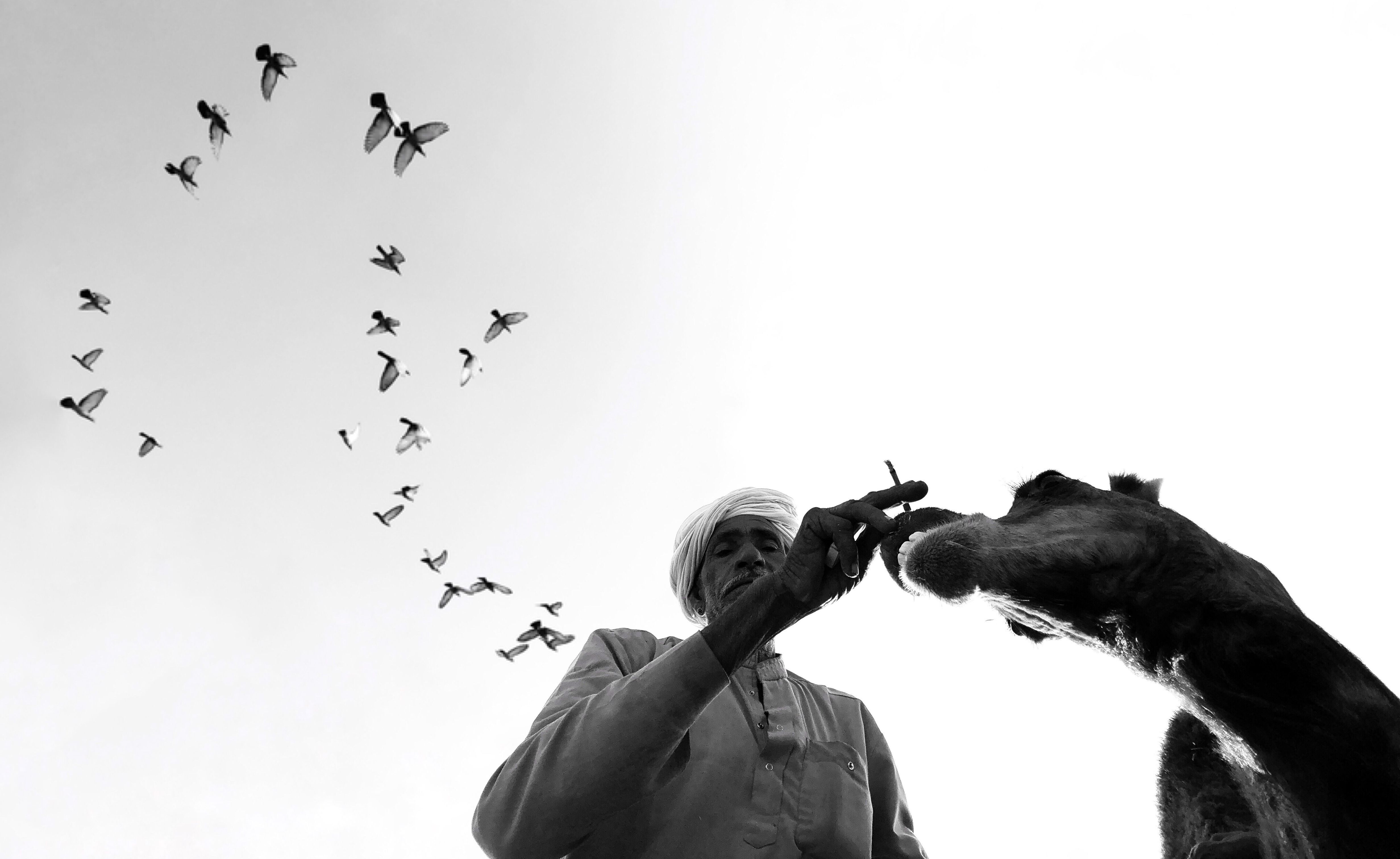 I observe a lot and I react to my observation by making a photo. What I like the most about this photo is the composition. The turban man with his camel in open ground and the birds flying as if it's coming out of his shoulder.